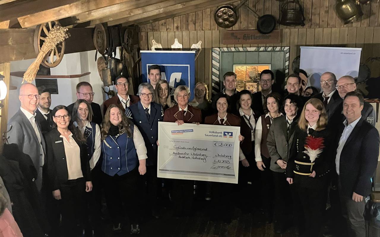 Vorstandsmitglied Andreas Ermecke übergab den symbolischen Scheck in Höhe von 25.000 Euro an den Musikverein Medelon, den Musikverein Düdighausen, die Jägerkapelle Hesborn, die Negertalmusikanten e. V. Siedlinghausen, die Stadtkapelle "Concordia" Hallenberg e. V., den Spielmannszug Altastenberg, die Knappenkapelle Dreislar, die Blasmusik Niedersfeld e. V., den Spielmannszug Züschen und an den Spielmannzug Blau-Weiß Oberschledorn e. V.