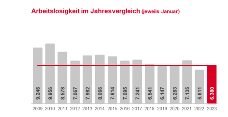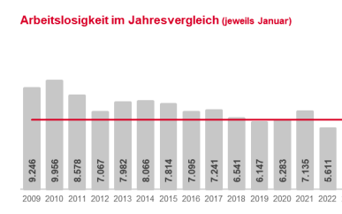 Im Vergleich zum Vorjahr fällt der Anstieg deutlich aus: Im Januar 2022 lag die Quote bei 3,8 %. Rund 770 Menschen mehr als im vergangenen Januar sind ohne Job. Ein Grund dafür sei neben saisonalen Aspekten nebenukrainische Schutzsuchende, so die Agentur. Sie werden seit Juni durch die Jobcenter betreut.