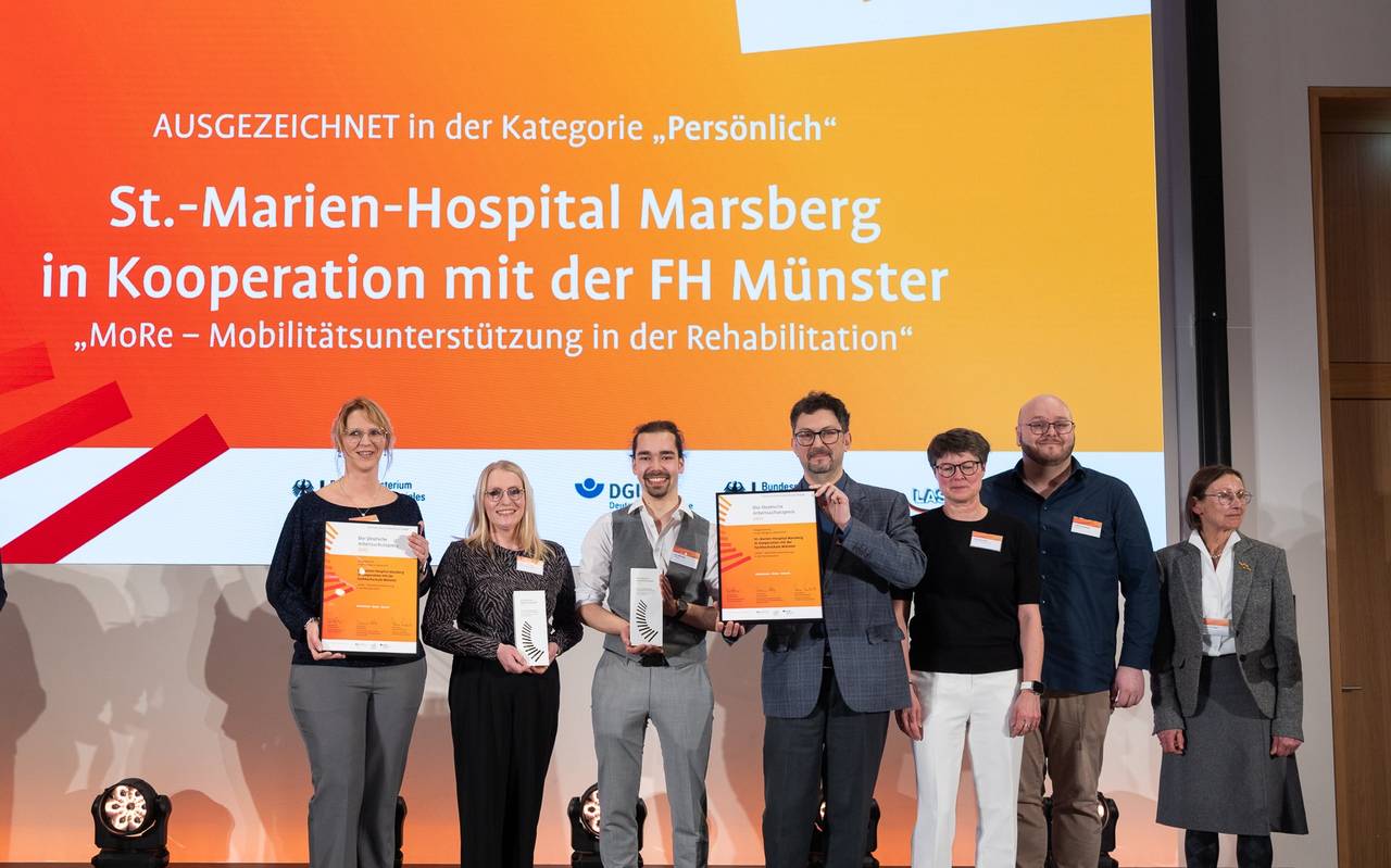 Ergotherapeutin Marion von Rüden und Physiotherapeutin Kristin Schulte können es noch gar nicht fassen: Sie haben in Berlin zusammen mit Leon Wösting und Prof. Dr.-Ing. David Hochmann von der FH Münster den Deutschen Arbeitsschutzpreis in der Kategorie „persönlich“ entgegengenommen.