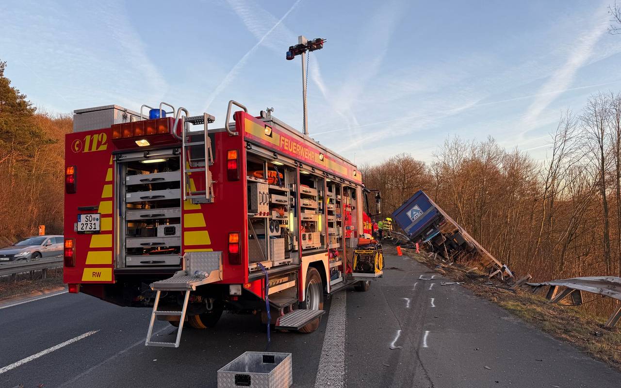 Ein Kran hat den LKW auf der A445 geborgen. Wegen der Bergungsarbeiten war die A445 in Richtung Neheim nach Auskunft der Autobahnpolizei bis 23 Uhr 11 gesperrt.