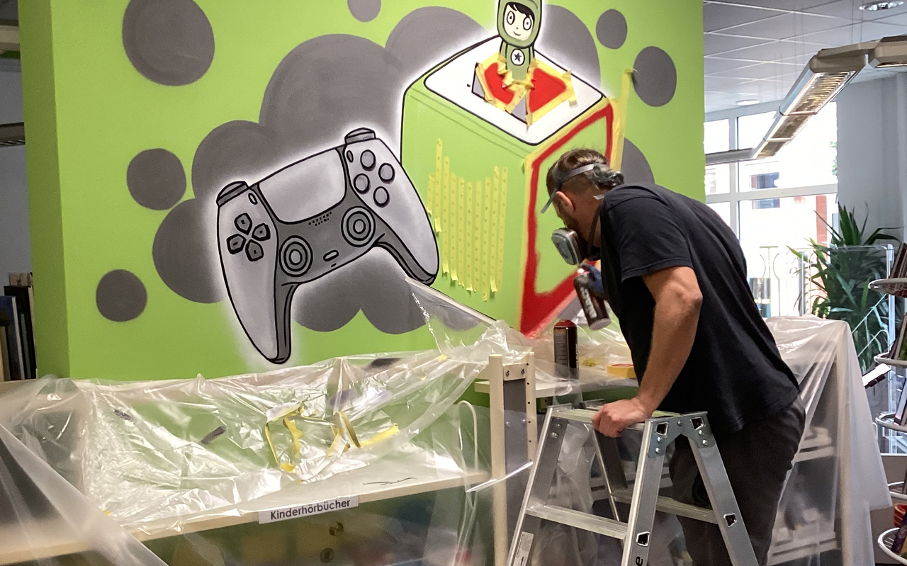 Der so genannte Non-Book-Bereich für Kinder und Jugendliche hat jetzt einen neuen Standort. Hier befinden sich die Konsolen-Spiele, Spielfilme, ein Blu-ray-Player und Hörspiele. Ein tolles Wandbild des Künstlers Henning Marten Feil (Norbert3000), mit dem sich die Teilnehmenden der Zukunfts-Bib in Kontakt gesetzt hatten, schmückt nun auch dauerhaft diesen Bereich.
