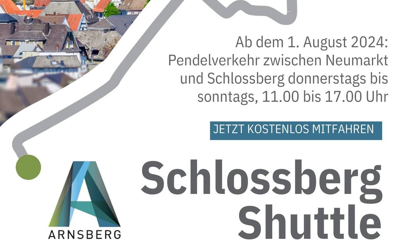 Die Stadt Arnsberg empfiehlt Besucherinnen und Besuchern, die ihren Ausflug nach Arnsberg und auf den Schlossberg zum Wochenende planen, ihren Wagen einfach z.B. in der Tiefgarage am Neumarkt zu parken und von dort aus direkt, unkompliziert und zudem noch kostenfrei den Shuttle-Transfer zum Schlossberg zu nutzen. Der Shuttle-Bus pendelt zunächst in einem Testzeitraum von sechs Wochen mit einer Option zur Verlängerung bis nach den Herbstferien.