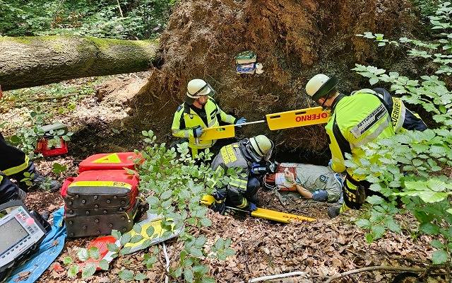 Die Arnsberger Feuerwehr hat mit dem Landesbetriebes Wald und Holz das Retten im Wald geübt. Im Jugendwaldheim Obereimer wurden unter anderem die Ranger und das pädagogische Personal für den Umgang mit Verunglückten im Wald geschult, heißt es. Zum Abschluss konnte das Erlernte in die Praxis umgesetzt werden. Angenommen wurde, dass ein Teilnehmer einer Wandergruppe eine Böschung herab gerutscht ist und in dem Loch unter der Wurzel eines umgestürzten Baumes liegt. Es wurde angenommen, das der Verunglückte schwer verletzt ist. Die Mitarbeiter des Landesbetriebes Wald und Holz setzten nun die Rettungskette in Gang.