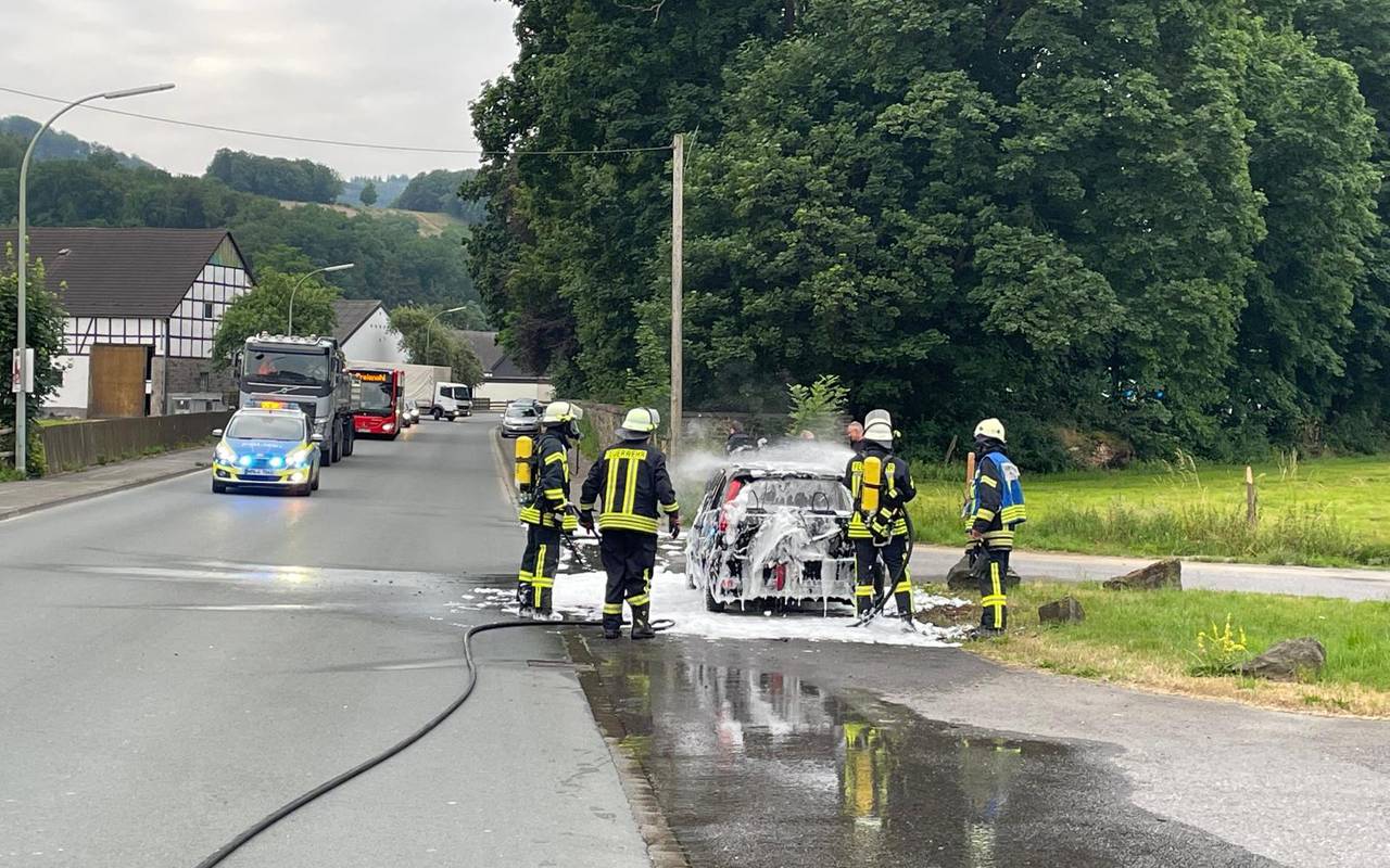 Ein brennendes Auto hat heute kurzzeitig den Verkehr in Meschede-Berge lahmgelegt. Nach Angaben der Mescheder Feuerwehr wurde sie gegen 05:50 Uhr in Berge zu einem Einsatz gerufen. Dort brannte am Ortsausgang Richtung Olpe ein Auto. Das Fahrzeug wurde durch die Feuerwehren aus Berge und Visbeck gelöscht. Es brannte komplett aus. Zwischenzeitlich war die Straße wegen der Löscharbeiten voll gesperrt.