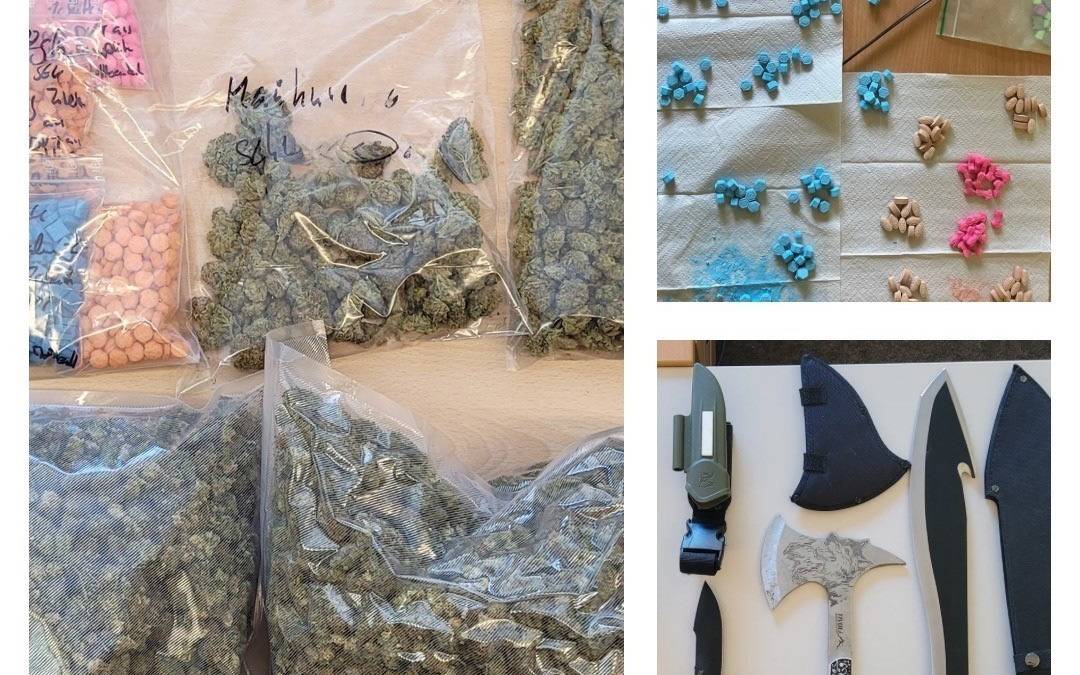 Nach umfangreichen Ermittlungen im Drogenmilieu hat es im HSK Festnahmen gegeben. Die Beamten stellten bei insgesamt 7 Wohnungsdurchsuchungen in Brilon eine nicht geringe Menge Marihuana, Ecstasy-Tabletten und andere Drogen sicher. Bei den Wohnungsdurchsuchungen wurden außerdem mehrere Hieb- und Stichwaffen sowie Bargeld beschlagnahmt. Vier polizeibekannte Briloner im Alter zwischen 27 und 55 Jahren wurden vorläufig festgenommen. Alle sind derzeit in Untersuchungshaft. Die Ermittlungen laufen.