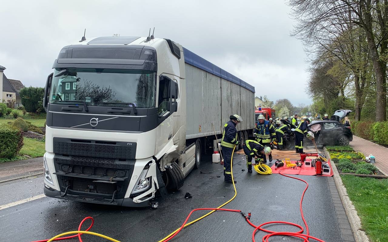 Auch die Briloner Feuerwehr war heute Mittag bei dem Verkehrsunfall in Altenbüren im Einsatz. Auf der Straße Briloner Tor war ein 85-jähriger PKW Fahrer mit einem LKW kollidiert. Da die Fahrertür nach dem Unfall nicht mehr geöffnet werden konnte, befreite die Feuerwehr den eingeschlossenen Fahrer mit hydraulischem Rettungsgerät. Er wurde bei dem Unfall verletzt, ebenso seine Beifahrerin.