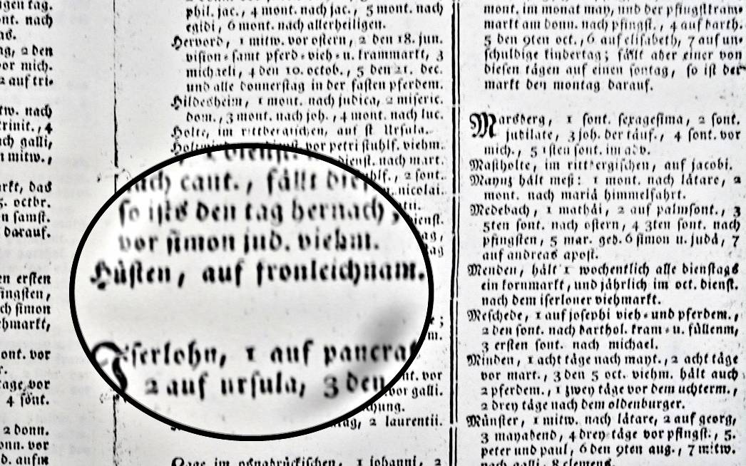 1774 erstmalige schriftliche Erwähnung eines Jahrmarktes in Hüsten im kurkölnischen Staats- und Landkalender für das Jahr 1774