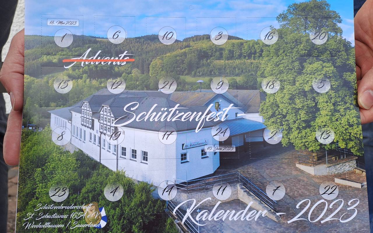 Ein Countdown bis bis zum Schützenfest: In Eslohe-Wenholthausen gibt es in diesem Jahr vor dem Schützenfest einen Schützenfestkalender im Stile eines Adventskalenders. 24 Tage vor dem Schützenfest am 10. Juni können die Schützenfestfans in Wenholthausen jeden Tag ein Türchen des Kalenders öffnen und unterschiedliche Preise gewinnen. So soll die Wartezeit auf das Schützenfest verkürzt werden. Der Kalender kostet zehn Euro und wird ab dem 29. April in der Bäckerei Franzes in Wenholthausen verkauft.