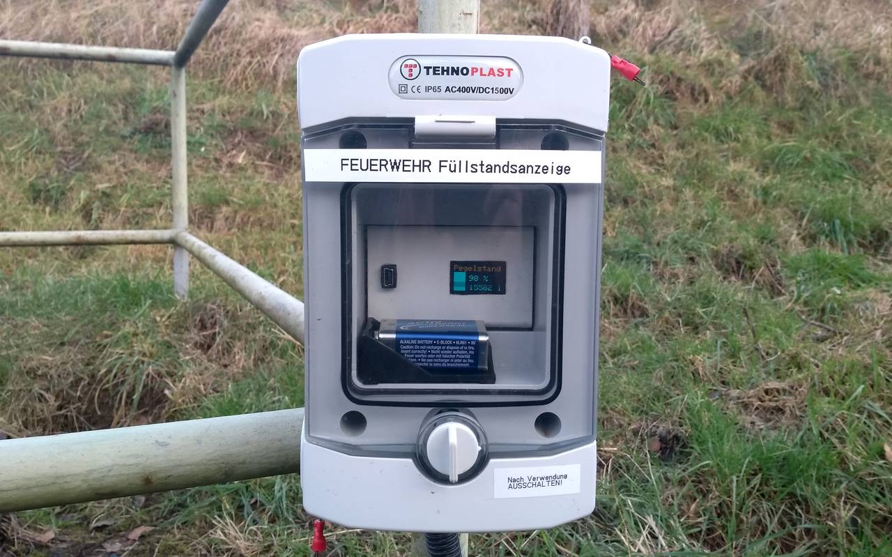 Die Löschgruppe in Arnsberg-Wennigloh hat sich überlegt, wie die Sicherheit von Feuerwehrleuten verbessert werden kann. Bisher muss die Feuerwehr bei Einsätzen selber gucken, wieviel Wasser noch in den unterirdischen Löschwasserbehältern ist. Bei der neu entwickelten Methode übernimmt ein Ultraschallsensor diese zum Teil gefährliche Arbeit. Die Feuerwehr Arnsberg beschreibt das System in Kurzform so: Mit Hilfe eines Ultraschallsensors wird der Abstand zur Wasseroberfläche im Behälter gemessen. Der Messwert wird an ein Entwicklungsboard übermittelt. Dieses wandelt ihn in ein darstellbares Format um. Welches dem Benutzer anschließend auf einer OLED-Anzeige grafisch in Prozent und Litern zur Verfügung gestellt wird.