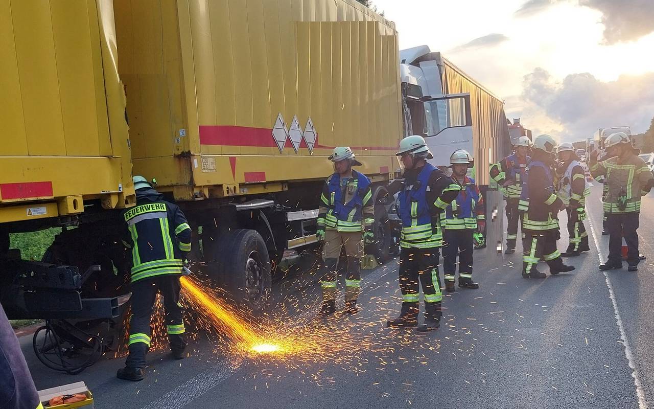 Nach Angaben der Feuerwehr Marsberg lief der Unfall lief glimpflich ab. Zwei Menschen wurden verletzt. Gemeldet war ein Verkehrsunfall mit einer eingeklemmten Person unter LKW-Beteiligung. Vor Ort stellte sich heraus, dass keine Person eingeklemmt war, die Fahrer der beteiligten LKW waren bereits aus ihren Fahrzeugen hinaus und wurden vom Rettungsdienst versorgt. Allerdings verlor ein LKW größere Mengen Kraftstoff, ebenso war Rauchentwicklung aus dem Motorblock festzustellen. Die Feuerwehr sicherte die Einsatzstelle, versorgte die Betroffenen bis zum Eintreffen des Rettungsdienstes, nahm auslaufende Betriebsstoffe auf und nahm einen Löschangriff in Bereitstellung vor. Ferner wurden Rettungsgeräte in Stellung gebracht, um bei der Bergung der Fahrzeuge zu unterstützen: Schließlich war des Führerhaus des auffahrenden LKW mit dem Anhänger des anderen Fahrzeugs verkeilt. Der Rettungsdienst versorgte die beiden leicht verletzten Fahrer. Dazu kam auch Gerät des Abrollbehälters AB-Rüst zum Einsatz, der vom ZFR in Meschede-Enste aus angerückt war. Für die Reinigung der Fahrbahn wurde eine Spezialfirma angefordert, für das Abschleppen waren ebenfalls Spezialfirmen vor Ort. Knapp 70 Einsatzkräfte der Freiwilligen Feuerwehr Marsberg aus den Einheiten Meerhof, Essentho, Oesdorf, Westheim, Marsberg, Giershagen, Leitmar, der Fachgruppe Drohne und der Führungsunterstützung waren vor Ort; ebenso der Rettungsdienst aus Marsberg, Lichtenau, Wünnenberg und Büren.. Die Einsatzleitung lag beim Leiter der Feuerwehr Marsberg, Cyrill Stute aus Essentho.