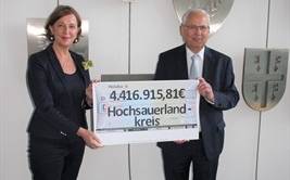 Schulministerin Yvonne Gebauer hat heute Landrat Dr. Karl Schneider einen symbolischen Scheck über 4,4 Millionen Euro aus dem Digitalpakt Schule übergeben. Das Geld ist für die Schulen in Trägerschaft des Hochsauerlandkreises. Sie können ihre Digitalisierungsstrategie damit fortsetzen, heißt es.