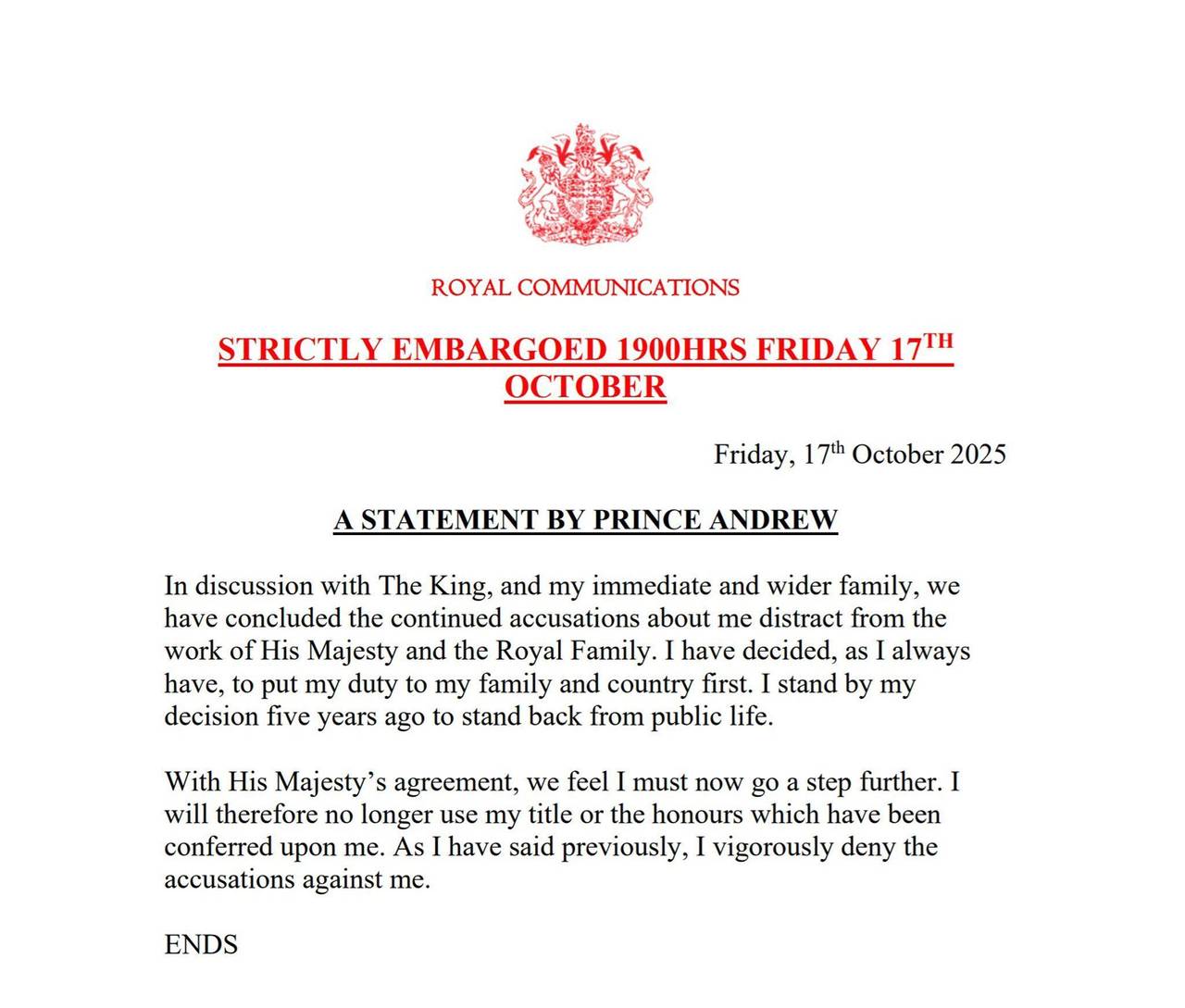Die Erklärung zum Ende von Andrew als Herzog von York.© Buckingham Palace/PA Media/dpa
