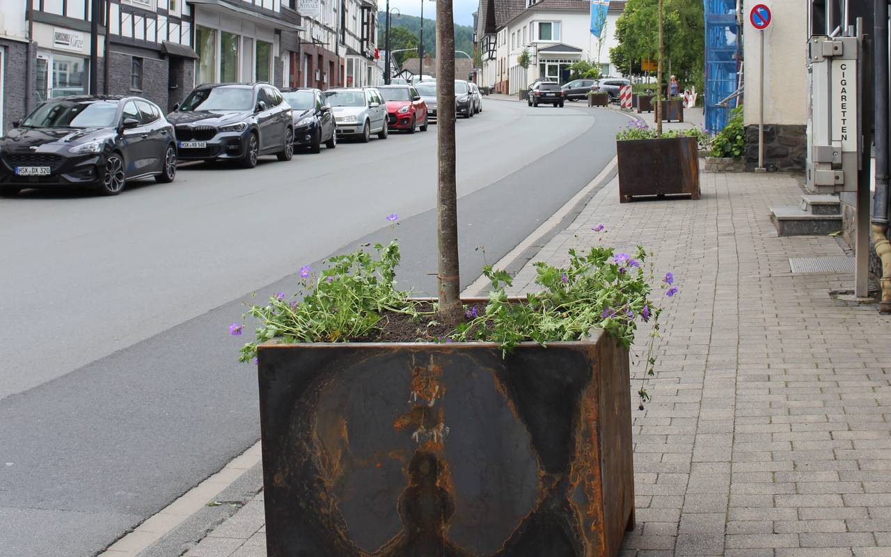 „Mit Robinien und Linden wurde bewusst auf Baumarten gesetzt, die bei uns inzwischen etabliert sind und gut mit Wärme und Trockenheit umgehen können, sodass die Bäume sicherlich in einigen Jahren vom mobilen Standort im Bereich der Stadt Hallenberg ausgepflanzt werden können", so der städtische Förster Dirk Zimmermann. Bei der Materialauswahl der mobilen Gefäße wurde darauf geachtet, dass diese sich in das Bild der historischen Altstadt einfügen. Durch das chemische Zusammenwirken von Metall, Sauerstoff und Wasser bildet sich in kurzer Zeit ein sogenannter natürlicher Edelrost.