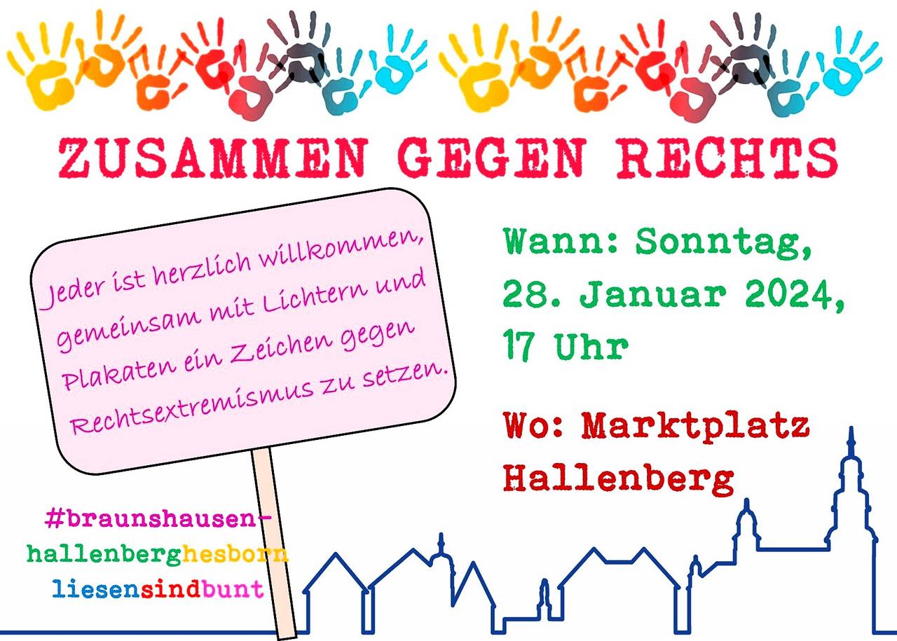 Im Sauerland gehen die Kundgebungen gegen Rechts weiter. Morgen will Hallenberg auf dem Marktplatz mit Lichtern und Plakaten ein Zeichen gegen Rechtsextremismus setzen. "Braunshausen.Hallenberg.Hesborn.Liesen sind bunt" ist das Motto. Die Demo läuft um 17 Uhr auf dem Marktplatz. Auch anderswo bei uns im Kreis stehen Menschen gegen Rechts auf. Die wohl größte Demonstration ist am kommenden Freitag in Neheim geplant.