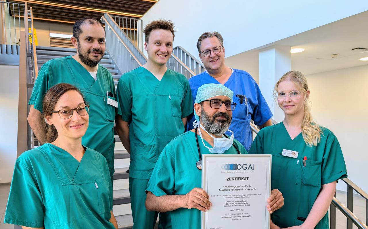 Die Klinik für Anästhesiologie am Klinikum Hochsauerland hat eine besondere Anerkennung erhalten: Sie wurde von der Deutschen Gesellschaft für Anästhesiologie und Intensivmedizin als Ausbildungszentrum für Sonografie, also für ausgezeichnet. Dieses Qualitätssiegel, genannt SONO-ZERT, tragen nur 14 Kliniken in ganz Deutschland.