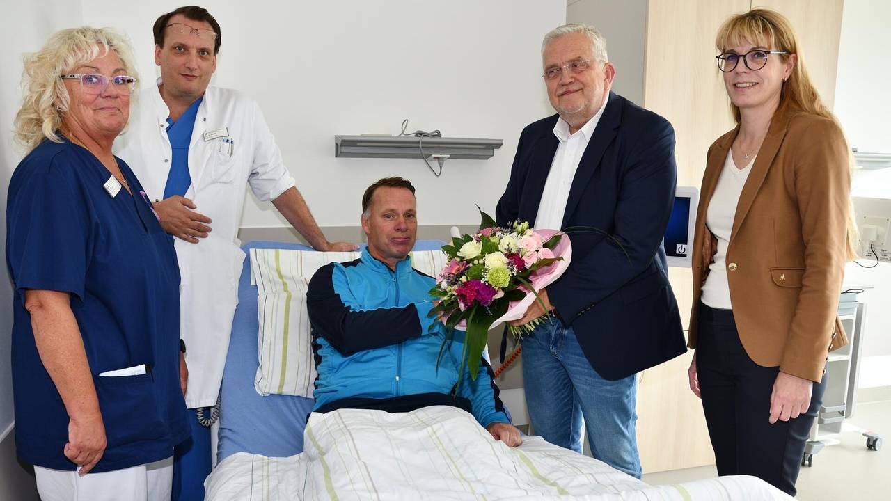 Als ersten Patienten begrüßten Werner Kemper, Sprecher der Geschäftsführung, und Dr. med. Dirk Böse, Chefarzt der Klinik für Kardiologie, Herrn Dieter Eickelmann.