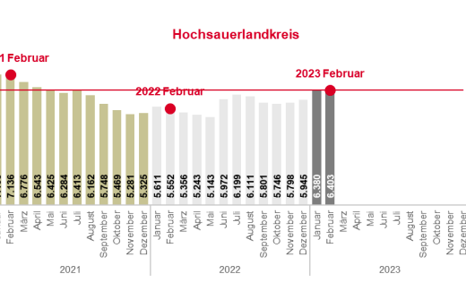 Die Zahl der Arbeitslosen ist im Hochsauerlandkreis im Februar 2023 um 23 Personen oder 0,4 Prozent gestiegen. Insgesamt waren 6.403 Personen arbeitslos gemeldet. Im Vergleich zum Februar des Vorjahres steigt die Zahl der Arbeitslosen um 851 Personen bzw. 15,3 Prozent. Die Arbeitslosenquote auf Basis aller zivilen Erwerbspersonen beträgt im Februar 4,3 Prozent. Vor einem Jahr belief sie sich auf 3,7 Prozent (+0,6 Prozentpunkte).