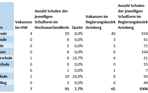 Im Hochsauerlandkreis liegt die Quote der unbesetzten Schulleiterposten bei 7,7 Prozent. Bei uns gibt es insgesamt 91 Schulen.