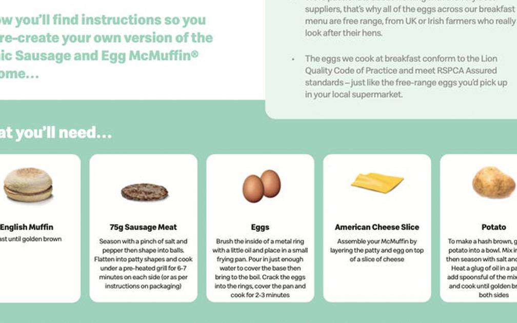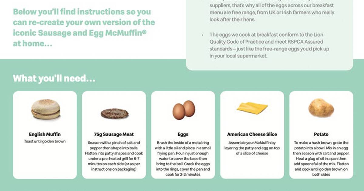 Zwar bieten manche Ketten Lieferservice an, doch jetzt gehen einige so weit und veröffentlichen sogar Rezepte für die Menschen, zum Nachkochen. Unter anderem McDonalds, das das Rezept für den McMuffin Sausage & Egg bekanntgegeben hat. Zugegeben, es ist doch relativ simpel.