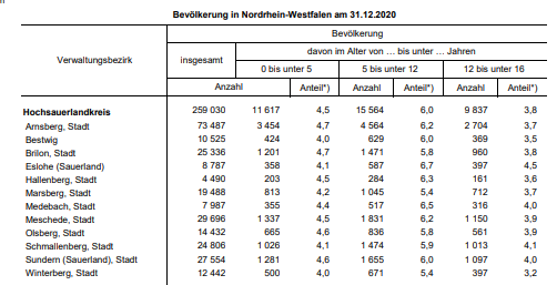 NRW-weit am jüngsten ist Augustdorf im Kreis Lippe. Dort sind 9 Prozent der Bewohner zwischen 5 und 11 Jahre alt. Der Anteil der Kinder unter 5 Jahren liegt bei 7 Prozent. Zum Vergleich: Im HSK sind es nur 4,5 Prozent.