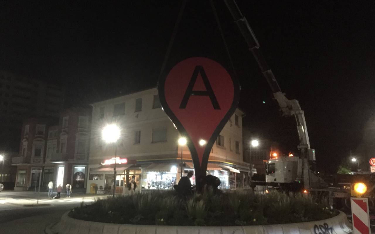 Das Kunstwerk "map" ist in der Nacht auf dem Kreisverkehr am Brückenplatz aufgebaut worden - 4 Stunden später als angekündigt.