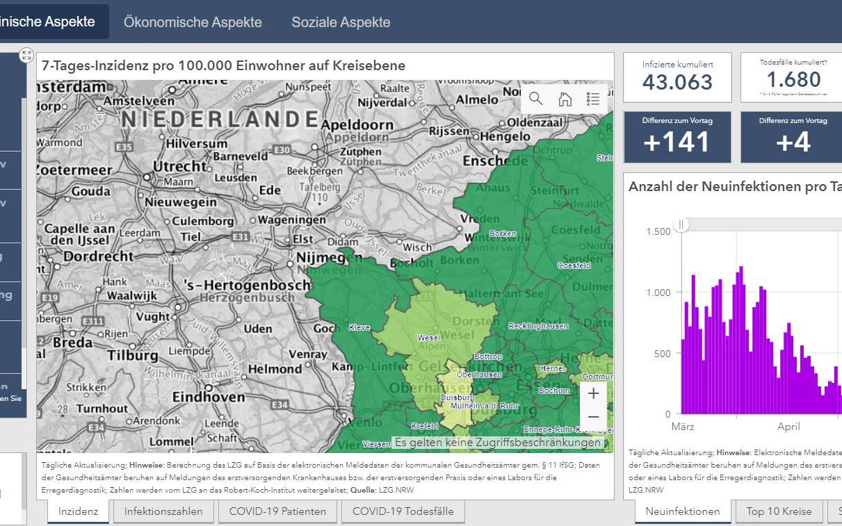 Das Corona-Dashboard der NRW-Landesregierung ist umfangreicher, als andere bekannte Dashboards, die es bislang auf dem Markt gibt. Denn und das ist das interessante: Dieses Dashboard konzentriert sich nicht nur auf die Sars-Cov-2/Covid-19-Fälle im Bundesland, sondern zeigt ebenso ökonomische wie soziale Aspekte auf.