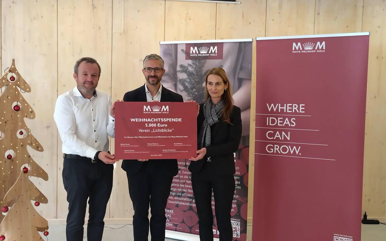 Der Holzverarbeiter May Melnhof Holz aus Olsberg hat unserer Radio Sauerland-Aktion Lichtblicke 5000 Euro gespendet. Der österreichische Konzern verzichtet jedes Jahr auf Weihnachtsgeschenke, bündelt die Mittel und unterstützt damit eine soziale Organisation an einem seiner Standorte. In diesem Jahr war das Brettschichtholz-Werk in Olsberg dran. Die einzelnen Standorte bewerben sich mit konkreten Vorschlägen. Die Mitarbeiterinnen und Mitarbeiter in Olsberg haben Lichtblicke vorgeschlagen. Den Spendenscheck haben Brigitte Deichstätter und Mathias Simma, beide sind Geschäftsführer der May Melnhof Holz GmbH Olsberg sowie Arnulf Penker, Technischer Vorstand der Mayr Melnhof Holz Holding AG, übergeben. "Zum 25-jährigen Geburtstag freut es uns besonders, mit unserer Weihnachtsspende „Lichtblicke“ zu ermöglichen, so der Konzern.