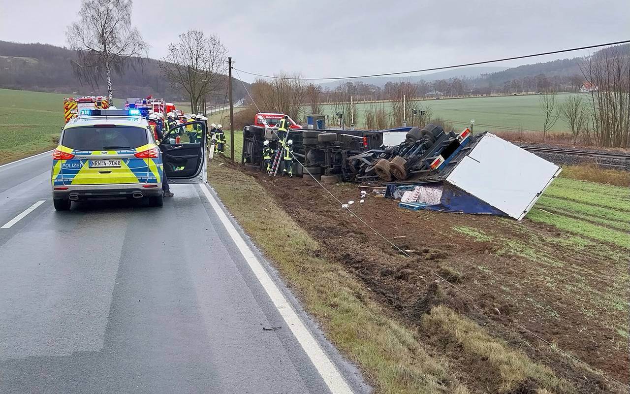 Gegen 13.40 Uhr war nach Angaben der Polizei ein 55-jähriger niederländische Fahrer mit seinem Lkw mit Anhänger die B 7 zwischen Westheim und der Anschlussstelle Marsberg zur Autobahn 44 unterwegs. Im Bereich der schnurgeraden Streckenführung kam der Lkw mit Anhänger nach rechts von der Fahrbahn ab, überfuhr den Bereich der Bankette und dann einen Böschungsbereich hinab. Der Lkw mit Anhänger stürzte auf die rechte Fahrzeugseite und kam auf einer Grünfläche zum Stillstand. Ersthelfer vor Ort konnten dem Fahrer aus dem Führerhaus heraushelfen. Die Feuerwehr war mit 60 Einsatzkräften vor Ort.