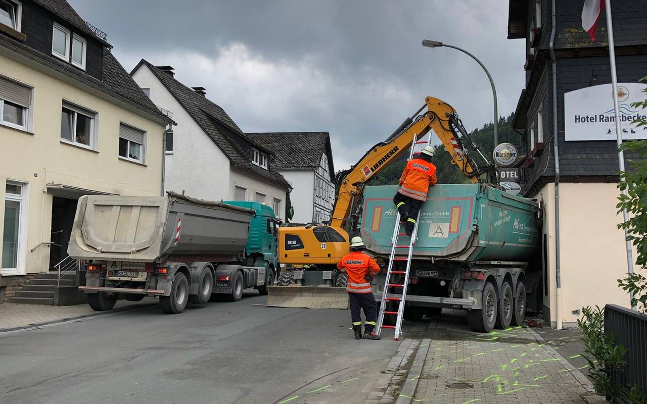 Nach dem schweren Verkehrsunfall in Bestwig-Ramsbeck hat ein Statiker am Mittwochnachmittag das Hotel überprüft. Demnach sei das Gebäude derzeit nicht einsturzgefährdet. Das teilte die Gemeinde Bestwig am Nachmittag mit. Ein 50-jähriger Mescheder war gestern Mittag mit seinem Lkw auf gerader Strecke von der Straße abgekommen und in das Hotel gefahren. Der Fahrer wurde dabei schwer verletzt. Die Ramsbecker Ortsdurchfahrt ist noch voll gesperrt, morgen Vormittag (Donnerstag) soll die Straße wieder halbseitig befahrbar sein, hieß es von den Behörden. Dann soll eine Ampel den Verkehr regeln.