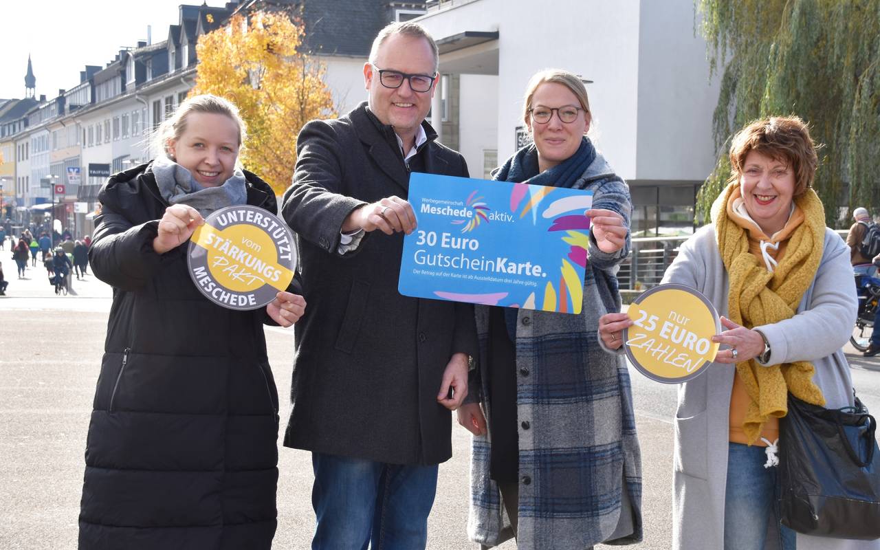 In Meschede startet heute eine Bonusaktion für Kunden von Mescheder Läden und Betrieben. Dafür wird Geld aus dem kommunalen Stärkungspakt genutzt, heißt es. Ab heute wird die „Meschede aktiv“-GutscheinKarte verkauft. Für Kunden bedeutet das einen Mehrwert von 5 Euro pro gekaufter GutscheinKarte. Insgesamt werden 2.000 Bonus-Gutscheine verkauft. Kunden zahlen 25 Euro und bekommen eine Karte im Wert von 30 Euro. Ab 15.11. können die Gutscheine eingelöst werden.