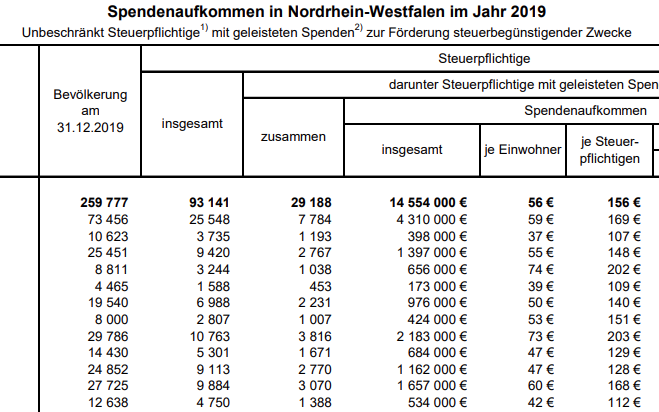 Im Jahr 2019 hatten landesweit 1,9 der 6,2 Millionen Steuerpflichtigen eine Spende in ihrer Steuererklärung angegeben; das war etwa jede(r) dritte Steuerpflichtige. Im Durchschnitt wurde von den Steuerpflichtigen ein Betrag von 633 Euro geltend gemacht. Auch bei dieser Betrachtung lag Kerken mit durchschnittlich 5 653 Euro je in der Einkommensteuererklärung geltend gemachten Spendenbetrag an der Spitze aller Städte und Gemeinden in NRW; es folgten die Stadt Olpe (2 576 Euro) und die Gemeinde Espelkamp im Kreis Minden-Lübbecke (2 025 Euro). Auf Platz 20 dieser Rangliste lag Düsseldorf (1 023 Euro) als erste Großstadt.