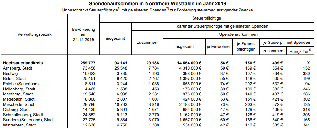 Das Statistische Landesamt weist darauf hin, dass in der vorliegenden Statistik zusammen veranlagte Ehegatten und Personen in eingetragenen Lebenspartnerschaften als ein Steuerpflichtiger gezählt werden. Es handelt sich um Ergebnisse der Lohn- und Einkommensteuerstatistik 2019. Sie können erst jetzt veröffentlicht werden, weil die anonymisierten Steuerdaten von den Finanzbehörden erst nach Abschluss aller Veranlagungsarbeiten für statistische Auswertungen zur Verfügung gestellt werden. Die hier dargestellten Informationen sind damit die aktuellsten, die zurzeit verfügbar sind. Spenden zur Förderung steuerbegünstigender Zwecke enthalten keine Spenden in den Vermögensstock einer Stiftung oder an politische Parteien und unabhängige Wählervereinigungen. Eine weitere Differenzierung nach Spendenzweck sei nicht möglich, so IT.NRW.