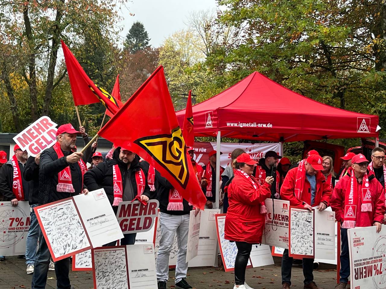 Aktionstag der IG Metall heute in Neheim. Betriebsräte aus Metall- und Elektrofirmen haben heute in Neheim ihrem Ärger über die aus ihrer Sicht schleppenden Tarifverhandlungen Luft gemacht. Vertreter aus rund 20 Betrieben aus den Bereichen der IG Metall-Geschäftsstellen Arnsberg und Unna haben lautstark beim Unternehmensverband noch einmal ihre Forderungen deutlich gemacht. Die IG Metall fordert 7 Prozent mehr Geld und 170 Euro für Auszubildende. Die Betriebsräte haben Riesen-Postkarten mit vielen Unterschriften der Mitarbeiterinnen und Mitarbeiter übergeben. Sie halten die Lohnforderung für gerechtfertigt.