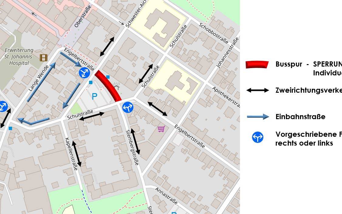 Damit wird der Verkehr am Bexleyplatz vorbeigeführt über die Engelbertstraße bis zur Kreuzung Schwester-Aicharda-Straße geführt, wo dann nur noch ein Links- oder Rechtsabbiegen möglich ist. Geradeaus ist die Verkehrsfläche zukünftig nur noch eine Busspur und dieser Bereich bleibt auch bis zur Fertigstellung gesperrt.