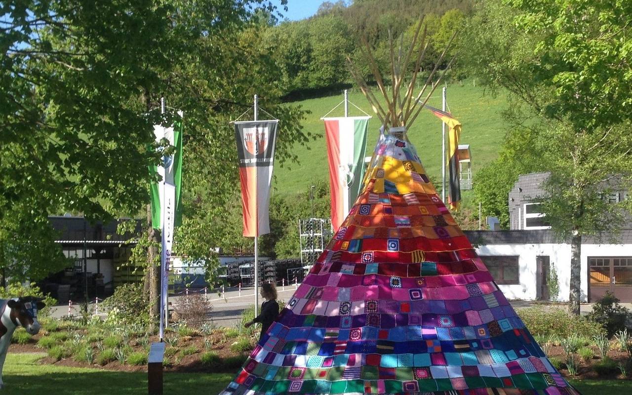 Dörfer, Vereine und andere Gruppen im Schmallenberger Sauerland sind aufgerufen eine Gemeinschaftsfahne zu gestalten. Dieses große Mitmachprojekt ist Teil des Festivals "Textile" im kommenden Jahr. Gestaltet werden sollen Stoffbahnen zum Thema "Was ist Dir wichtig?". Hinterher werden die Bahnen zu einer großen Gemeinschaftsfahne zusammengenäht. Anmeldeschluss für das Textile-Fahnenprojekt ist der 25.November 2020. Beim Tipi-Projekt 2018 hatten rund 800 Schmallenberger mitgemacht. Das Festival für textile Kunst läuft zum dritten Mal in Schmallenberg.