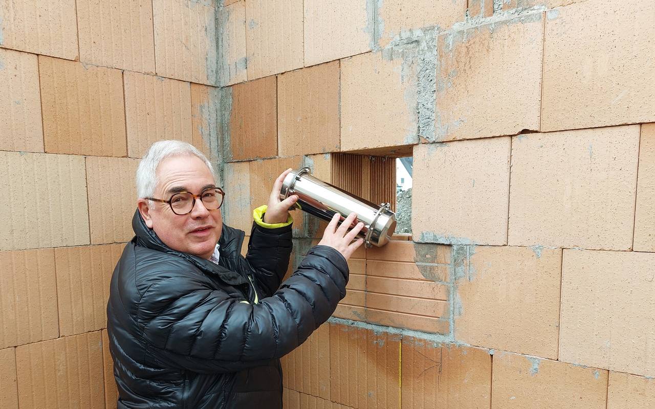 Der symbolische Grundstein enthält eine wasserdichte Zeitkapsel mit dem Text der Urkunde, den Ratsbeschluss zum Bau des Feuerwehrhauses, eine Tageszeitung vom Tag der Grundsteinlegung und Münzgeld. Wolfgang Fischer: „Dies soll dem Bau Glück bringen und wichtige Erinnerungen festhalten.“ Mit einem Hammer schlug der Bürgermeister dabei den Grundstein an seiner Position ein. Zuvor betonte er in seiner Ansprache, dass Feuerschutz in einer Stadt keine freiwillige Leistung sei: „Feuerschutz ist eine kommunale Pflichtaufgabe.“ Und „diese können wir bei uns in der Stadt Olsberg nur erfüllen, weil sich Bürgerinnen und Bürger freiwillig bereit erklären, diesen Dienst für die Allgemeinheit zu erfüllen; und dies 24 Stunden am Tag und 7 Tage die Woche. Unsere Kameradinnen und Kameraden sind für uns, die Bürgerinnen und Bürger in unserer Stadt, da.“ Dabei sei es besonders wichtig, die Aktiven mit der bestmöglichen Ausrüstung in den Einsatz zu schicken – „dazu gehören natürlich auch gute Gebäude“.