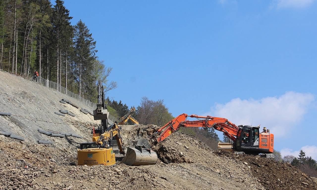 Mehr als 31.000 Kubikmeter Lehmboden hat Straßen.NRW dafür bereits gelöst, das ist mehr als in zehn olympische Schwimmbecken reinpasst. Viel davon wird gleich wieder verwendet, um einen stabilen Untergrund unter der neuen Fahrbahn herzustellen. Neben dem Bau der Straße selbst muss außerdem der Hang gesichert werden, auch ein Sicherheitsnetz wird am Hang angebracht. Probleme würde manchmal aus dem Hang austretendes Wasser machen, so Projektleiter Raimund Köster. Insgesamt laufen die Arbeit aber gut, man liege im Zeitplan. Voraussichtlich im Sommer dieses Jahres soll die neue Ortsumgehung bei Bad Fredeburg fertig sein.