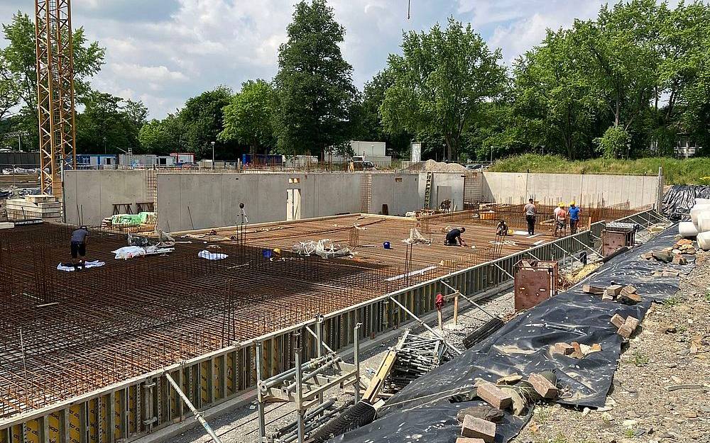 An den Fundamenten des Rathaus-Hochtrakts laufen die Vorbereitungen für das Ausbetonieren der Hohlräume zwischen den Fundamenten. Dadurch wird der Schutz vor möglicherweise eintretendem Grund- oder Oberflächenwasser (Starkregen oder Hochwasser der Ruhr) verbessert.