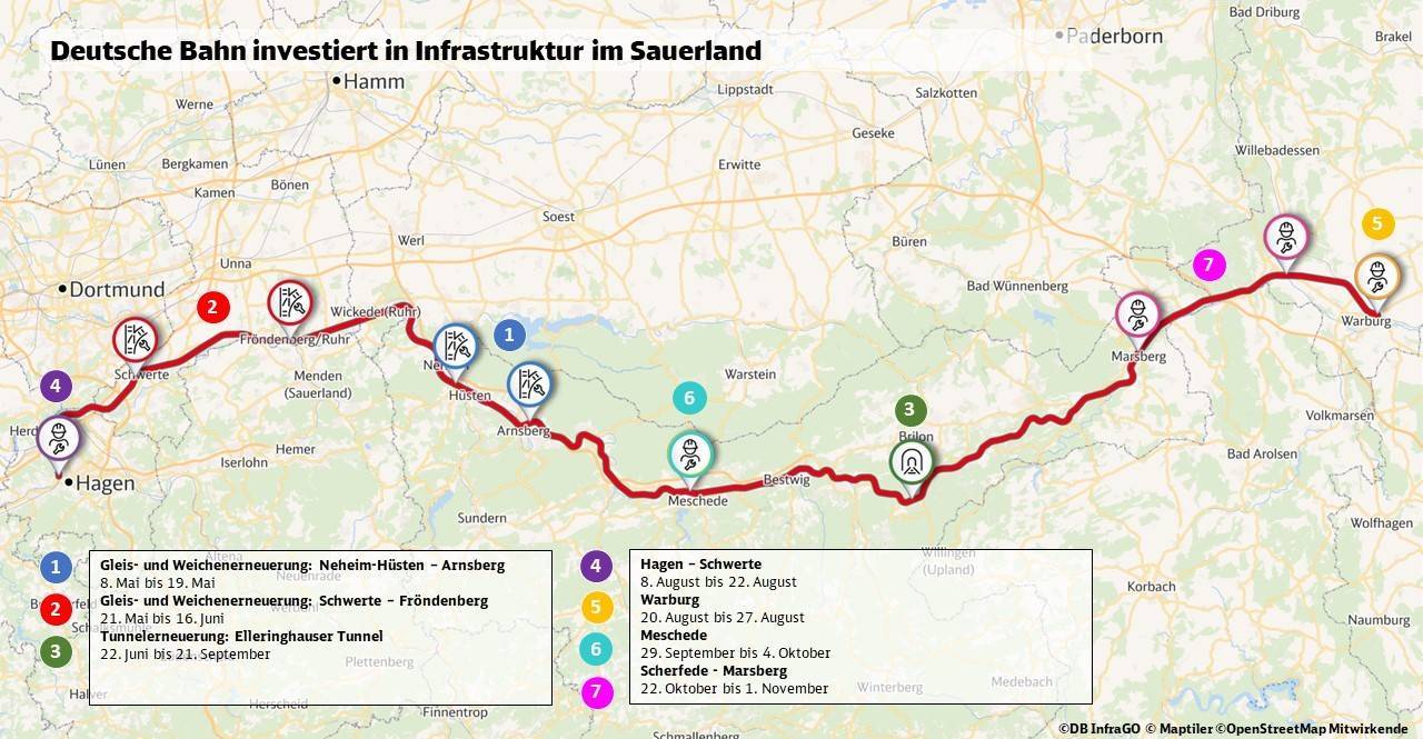 Auch in der zweiten Jahreshälfte wird die DB die Infrastruktur vom Ruhrgebiet über das Sauerland bis nach Westfalen weiter sanieren. Ab August sind Arbeiten in Hagen sowie auf den Strecken zwischen Warburg und Scherfede, Arnsberg und Bestwig, und zwischen Messinghausen und Warburg geplant.