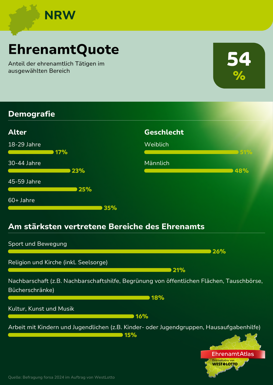 NRW-weit liegt die Ehrenamtsquote nur bei 54 Prozent. Die Herausgeber des Ehrenamtsatlas sehen im Hinblick auf den Nachwuchs ein großes Problem auf das Ehrenamt und damit auch auf die Gesellschaft zukommen. Aktuell sind nur 17 Prozent der ehrenamtlich engagierten Menschen zwischen 18 und 29 Jahre alt. Die größte Gruppe ist älter als 60 Jahre alt. Ihr Anteil liegt bei rund einem Drittel. Im Hochsauerlandkreis klagen viele Vereine über fehlenden Nachwuchs für die Führungsämter.