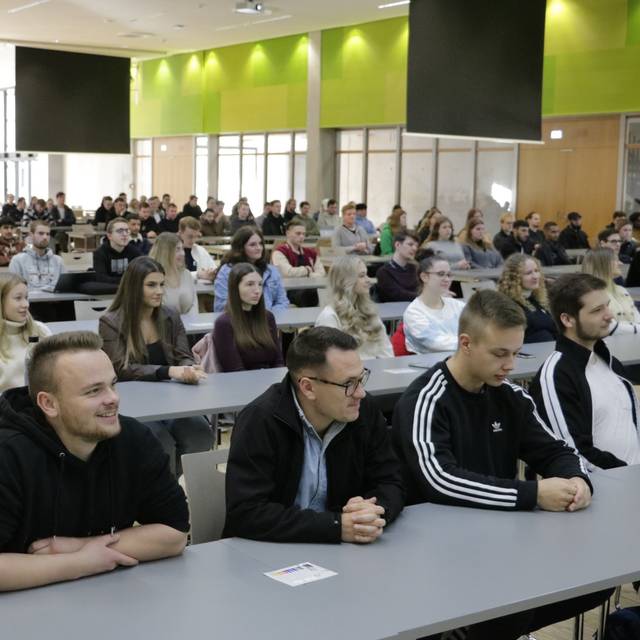 Erwachsene Begleitpersonen können die Vorlesungen im Foyer der Hochschule auf einer Videoleinwand verfolgen.
