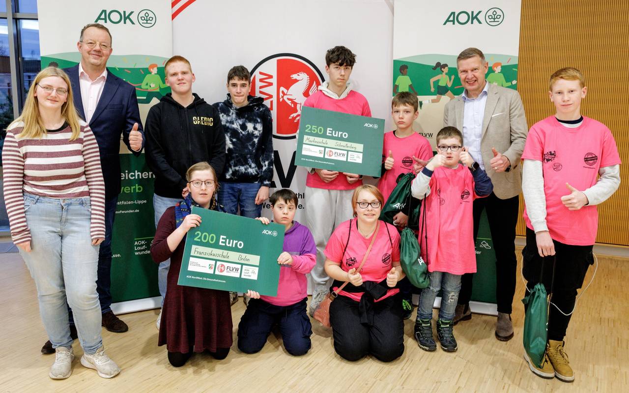 Zwei Schulen aus dem Hochsauerlandkreis gehören zu den lauffreudigsten Schulen in ganz Westfalen-Lippe. Die Franziskusschule aus Brilon und die Martinsschule aus Schmallenberg wurden jetzt bei der Siegerehrung des Laufabzeichen-Wettbewerbs im SportCentrum Kaiserau in Kamen ausgezeichnet und mit Urkunden sowie mit jeweils 250 Euro für die Klassenkasse belohnt. Im vergangenen Schuljahr haben rund 73.000 Schülerinnen und Schüler aus ganz Westfalen-Lippe an diesem Wettbewerb teilgenommen. Dabei gilt das Motto: Gemeinsam laufen und Spaß haben. „Die Franziskusschule und die Martinsschule haben eindrucksvoll bewiesen, wie einfach es ist, die Fitness und Ausdauer von Kindern und Jugendlichen durch regelmäßige Bewegung zu stärken. Beim gemeinsamen Laufen steht der Spaß im Vordergrund“, sagte Frank Simolka, Unternehmensbereichsleiter Kunde & Markt der AOK NordWest, bei der Siegerehrung.