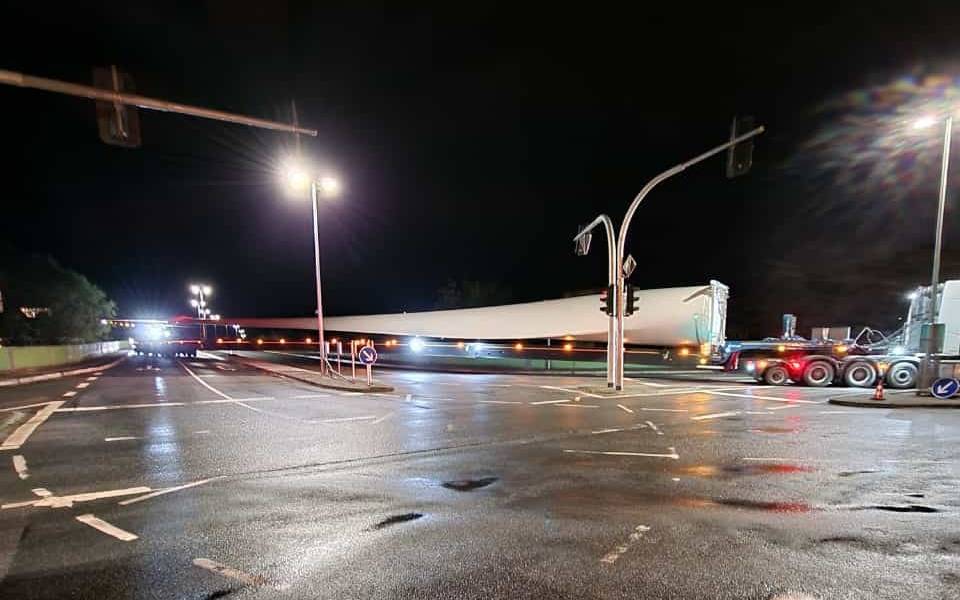 Heute Nacht sind die letzten Schwertransporte für den neuen Windpark am Mannstein in Olsberg geplant. Angeliefert werden drei riesige Rotorblätter. Länge: Rund 70 Meter. Insgesamt gab es rund 75 Schwertransporte durch den HSK.