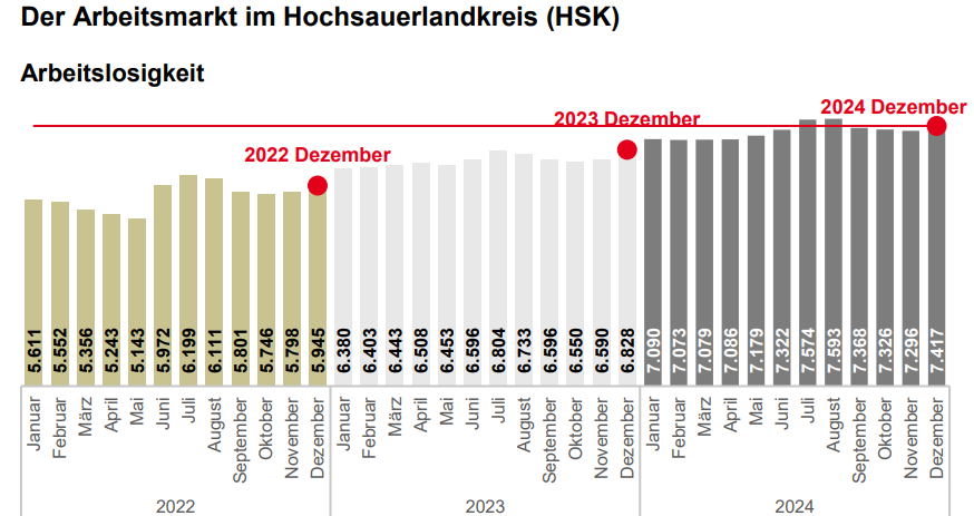 Die Zahl der Arbeitslosen ist im Hochsauerlandkreis im Dezember 2024 gestiegen. Insgesamt waren 7.417 Personen arbeitslos gemeldet. Verglichen mit den Zahlen des Vormonates sind dies 121 Personen oder 1,7 Prozent mehr. Im Vergleich zum Dezember des Vorjahres steigt die Zahl der Arbeitslosen um 589 Personen bzw. 8,6 Prozent. Die Arbeitslosenquote auf Basis aller zivilen Erwerbspersonen beträgt im Dezember 4,9 Prozent. Vor einem Jahr belief sie sich auf 4,6 Prozent (+0,3 Prozentpunkte).