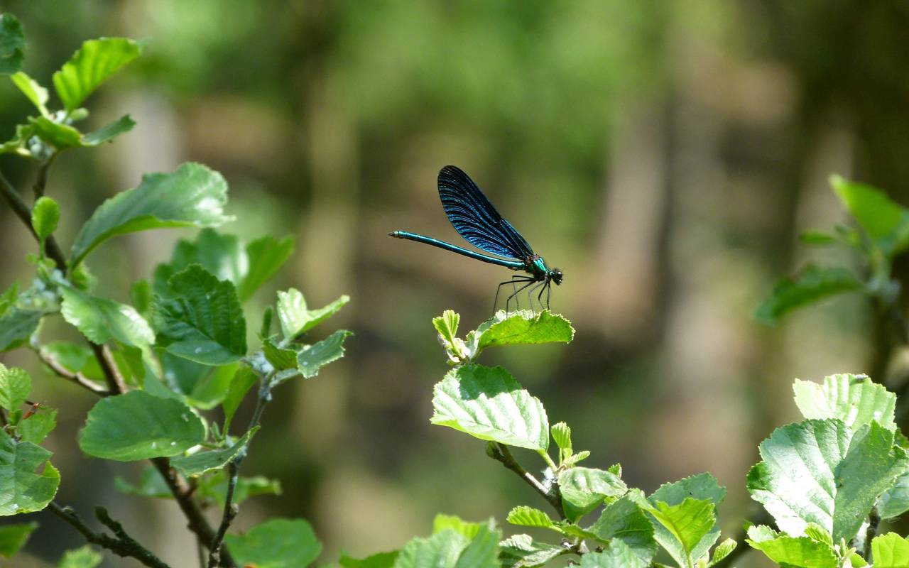 Bei einem natürlich verlaufenden Bach fließt alles . Ein tief eingeschnittener, zu gerade verlaufender reißender Strom oder ein laut plätschernder Bachverlauf mit hohen Stufen gilt als naturfern und deshalb artenarm. Ein naturnaher Mittelgebirgsbach ist breit, flach und gut gefüllt mit dem für die Region typischen Schotter oder Kies. Alle Übergänge im Verlauf des Flusses sind im wahrsten Sinne des Wortes fließend gestaltet – also auch die Übergänge vom Flussbett in seine Aue. So kann sich auch bei längeren starken Regenfällen, wie in den letzten Wochen, das Wasser auf natürliche Weise in seiner Aue ausbreiten ohne Schäden anzurichten. „Im besten Fall umgibt den Bach ein Licht durchfluteter Auwald mit typischen Laubbaumarten wie beispielsweise der Schwarzerle, die an Hochwasserzeiten angepasst ist. Hier finden beeindruckende Arten ihren Lebensraum. Mein Favorit ist die Blauflügel-Prachtlibelle“, schwärmt Förster Carsten Arndt, langjähriger Leiter des Lehr- und Versuchsreviers Hirschberg.