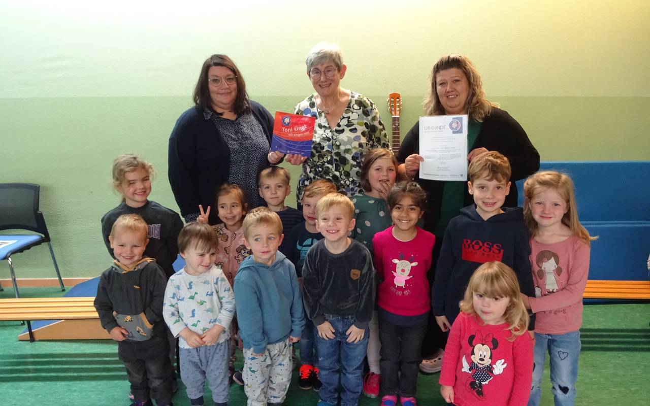 Die „Toni singt“ Plakette schmückt ab jetzt den Eingang der Kindertagesstätte und zeigt so der Öffentlichkeit, dass die Erzieherinnen in ihrer Einrichtung das kindgerechte Singen auf der Basis qualifizierter musikalischer Grundlagen und Techniken und pädagogisch fundiert praktizieren.