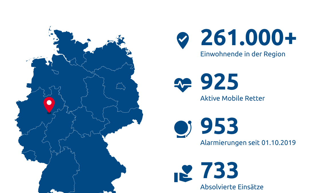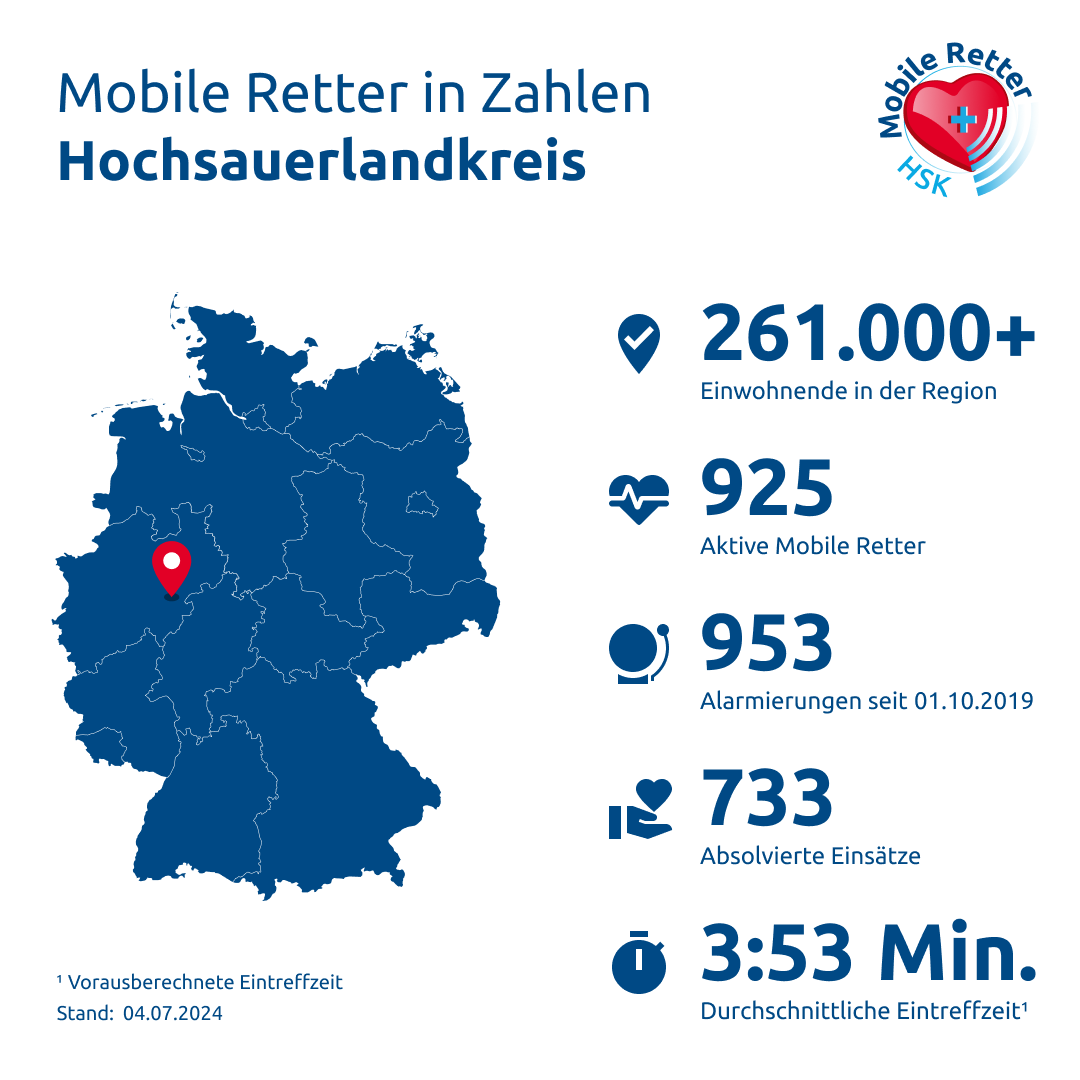 Mithilfe der Smartphone-basierten Ersthelfer-Alarmierung werden medizinisch qualifizierte Ersthelfer*innen nach Wahl des Notrufs 112 durch die Leitstelle über die GPS-Komponente ihrer Smartphones geortet und parallel zum Rettungsdienst alarmiert. Durch die örtliche Nähe können Mobile Retter oft schneller als der Rettungsdienst am Notfallort sein und bis zu dessen Eintreffen bereits qualifizierte lebensrettende Maßnahmen einleiten. Der Hochsauerlandkreis betreibt die Smartphone-basierte Ersthelfer-App "Mobile Retter" seit dem 01.10.2019. In dieser Zeit konnten 733 Einsätze absolviert werden. Durch diese habe sich die Versorgung von Patienten mit Herz-Kreislauf-Stillstand verbessert, so ein Sprecher des Hochsauerlandkreises. .Hier seht ihr die Einsatzbilanz der mobilen Retter: