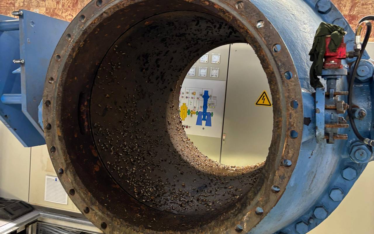 Im Sorpekraftwerk des Ruhrverbands wurde in dieser Woche ein Kugelschieber zur Revision ausgebaut. Die Arbeiten waren Teil einer geplanten Instandhaltungsmaßnahme, um die Betriebssicherheit des Kraftwerks langfristig zu gewährleisten. Die Arbeiten waren Teil einer geplanten Instandhaltungsmaßnahme, um die Betriebssicherheit des Kraftwerks langfristig zu gewährleisten. Vor den Turbinen und Rückpumpen des Kraftwerks befindet sich jeweils ein Kugelschieber. Diese Armaturen stammen noch aus der Bauzeit der Sorpetalsperre und waren inzwischen undicht. Daher werden sie nacheinander ausgebaut und in einem Fachbetrieb überholt. Den Anfang machte der Kugelschieber vor der Pumpe 2. Da die Dauer der Reparatur im Vorfeld nicht genau abzuschätzen war, fiel die Wahl bewusst auf diese Leitung – sie konnte nach dem Ausbau mit Blindflanschen verschlossen werden, sodass der Kraftwerksbetrieb während der Revision fortgesetzt werden kann. Mitte Oktober wurde der Ausgleichsweiher entleert und das Kraftwerk außer Betrieb genommen. Die Wasserabgabe aus der Sorpetalsperre erfolgte in dieser Zeit über den Grundablass. Am Montag vor einer Woche hat der Ruhrverband mit den Arbeiten begonnen und den rund sieben Tonnen schwerne Kugelschieber ausgehoben. Im nächsten Schritt wurden die Blindflansche montiert und die Kraftwerksleitung wieder befüllt.