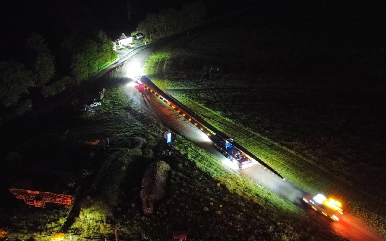 Heute um 2:35 ist der siebte von 15 Bladeliftertransporten erfolgreich im Windpark Sundern angekommen. Darüber hat uns die PNE AG informiert. Das Unternehmen baut und betreibt den Windpark in Allendorf. Die Bedingungen für den Transport waren herbstlich: Regen und Nebel. Später am heutigen Tag wird das Blatt am Standort der Windenergieanlage 3 im Windpark entladen und dann geht es in einer Leerfahrt heute Abend wieder zurück zur Umladefläche in Müschede.