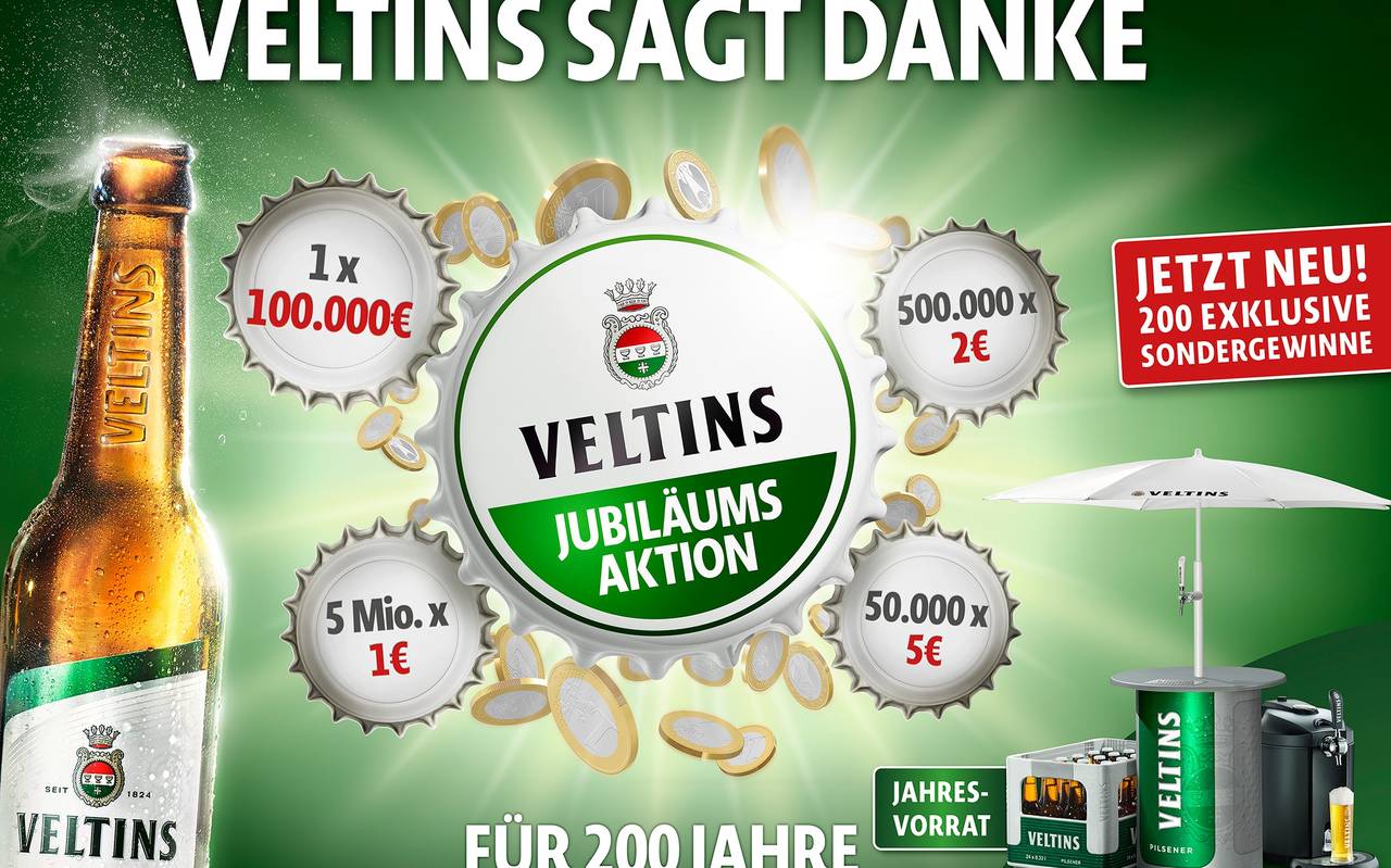 Zum 200-jährigen Jubiläum startet Veltins seine deutschlandweite Kronkorken-Aktion. Dabei gibt es u.a. 6 Mio Euro zu gewinnen.
